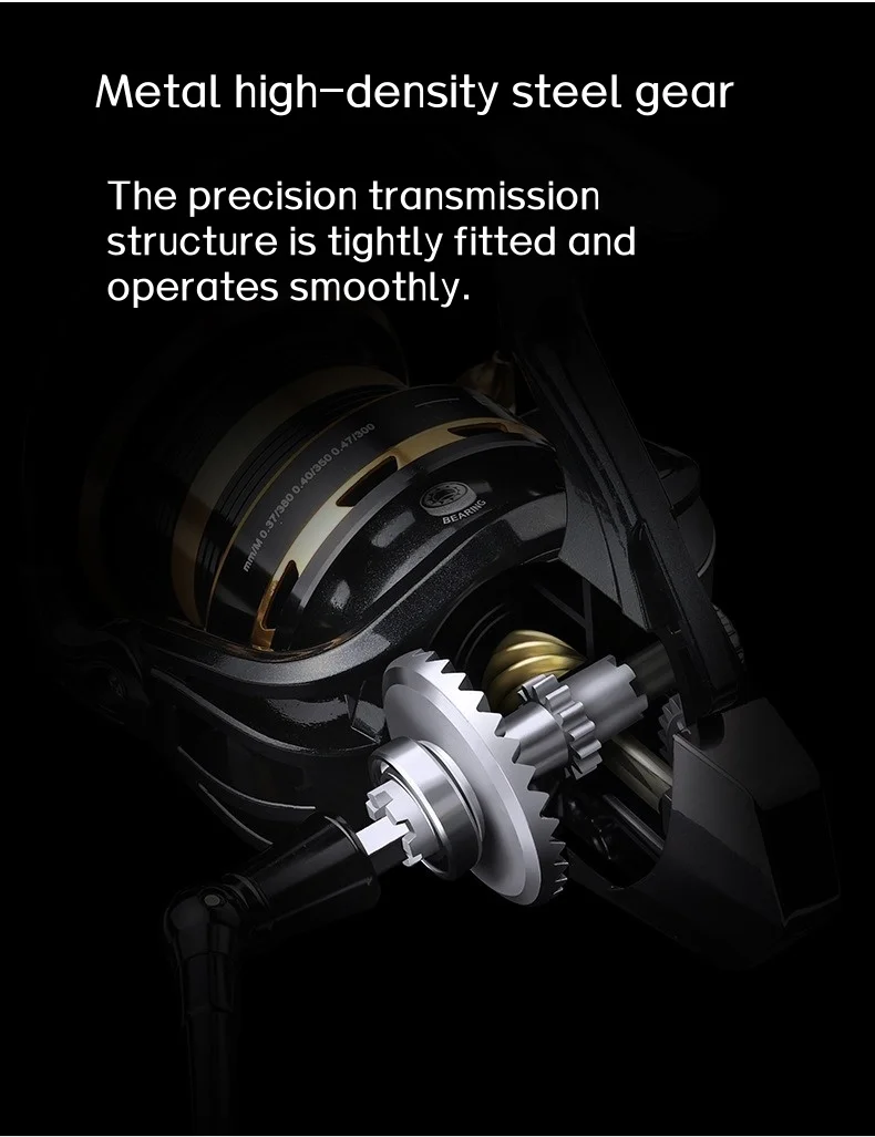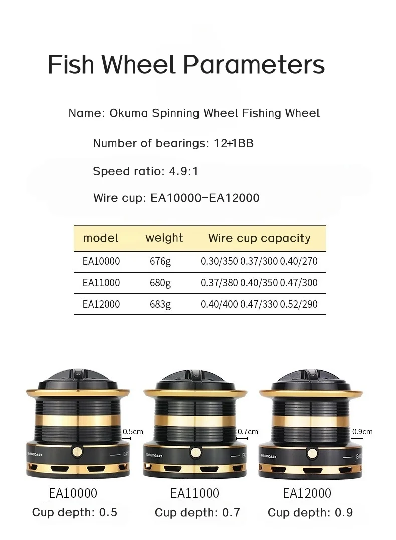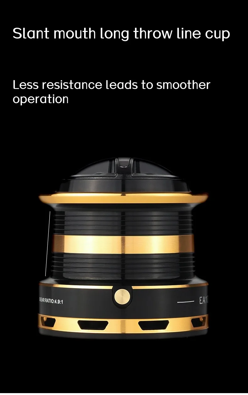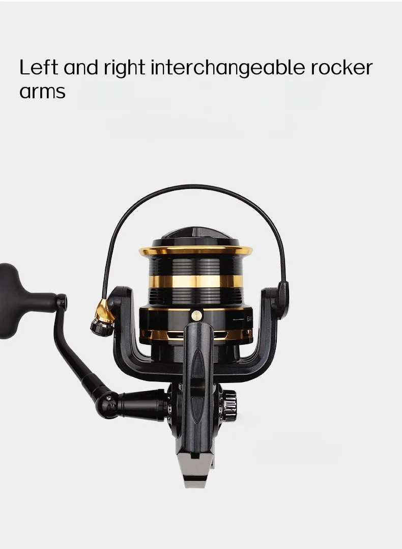 (1) EA10000-12000 series fishing reel product configuration: aluminum alloy engraved wire cup, metal folding rocker arm, left and right interchangeable rocker arms, no gap reaction structure.